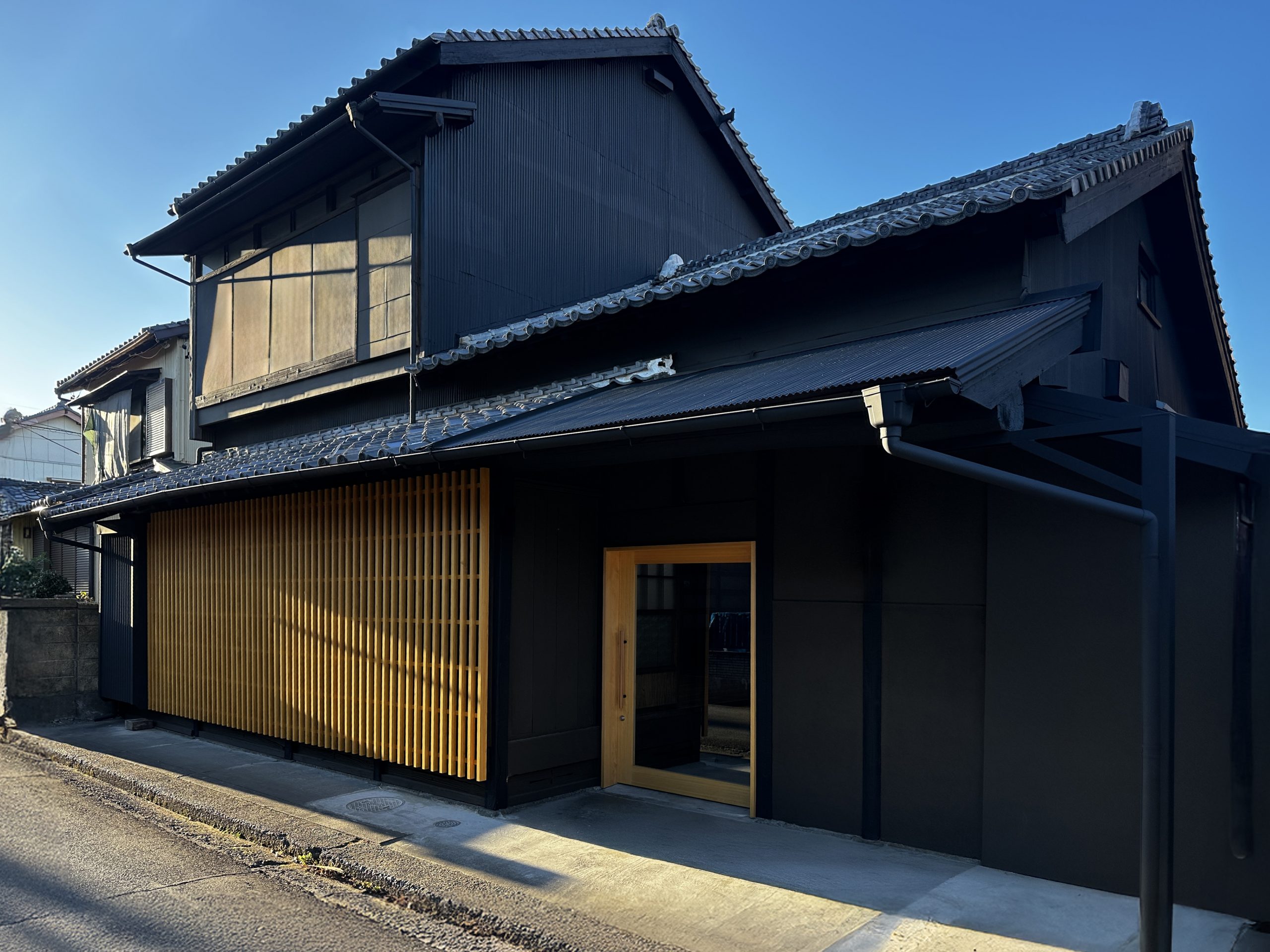 外装を全体的にトーンダウンすことで、建物がもつ年月の深みを自然に引き出すデザインとした。また、サッシ面には木格子を設けることで町家らしい表情を演出。夜間には室内の光が柔らかく滲み出ることで、地域の景観に溶け込みながら温かみのある賑わいを生み出した。